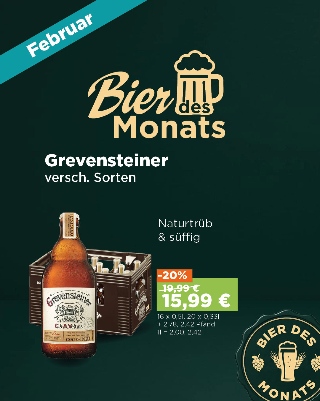 Preis: 19,99 €Angebotspreis: 15,99 €zzgl. 3,10 € PfandGrundpreis: 2,42 €pro lDas naturtrübe Grevensteiner Original ist ein süffiges Landbier, das mit weichem Quellwasser und erntefrisch verarbeitetem Hopfen gebraut wird.Das ...