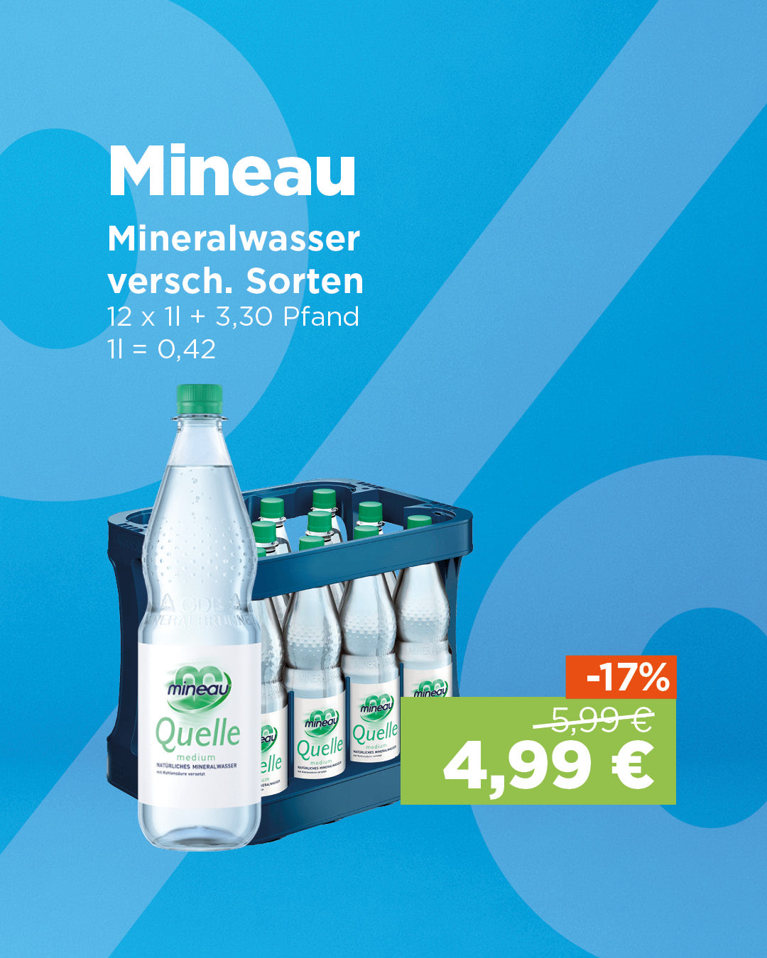 Preis: 5,99 €Angebotspreis: 4,99 €zzgl. 3,30 € PfandGrundpreis: 0,42 €pro lMineau Naturelle - ein stilles natürliches Mineralwasser.Ganz ohne Kohlensäure schmeckt es harmonisch und sanft.
